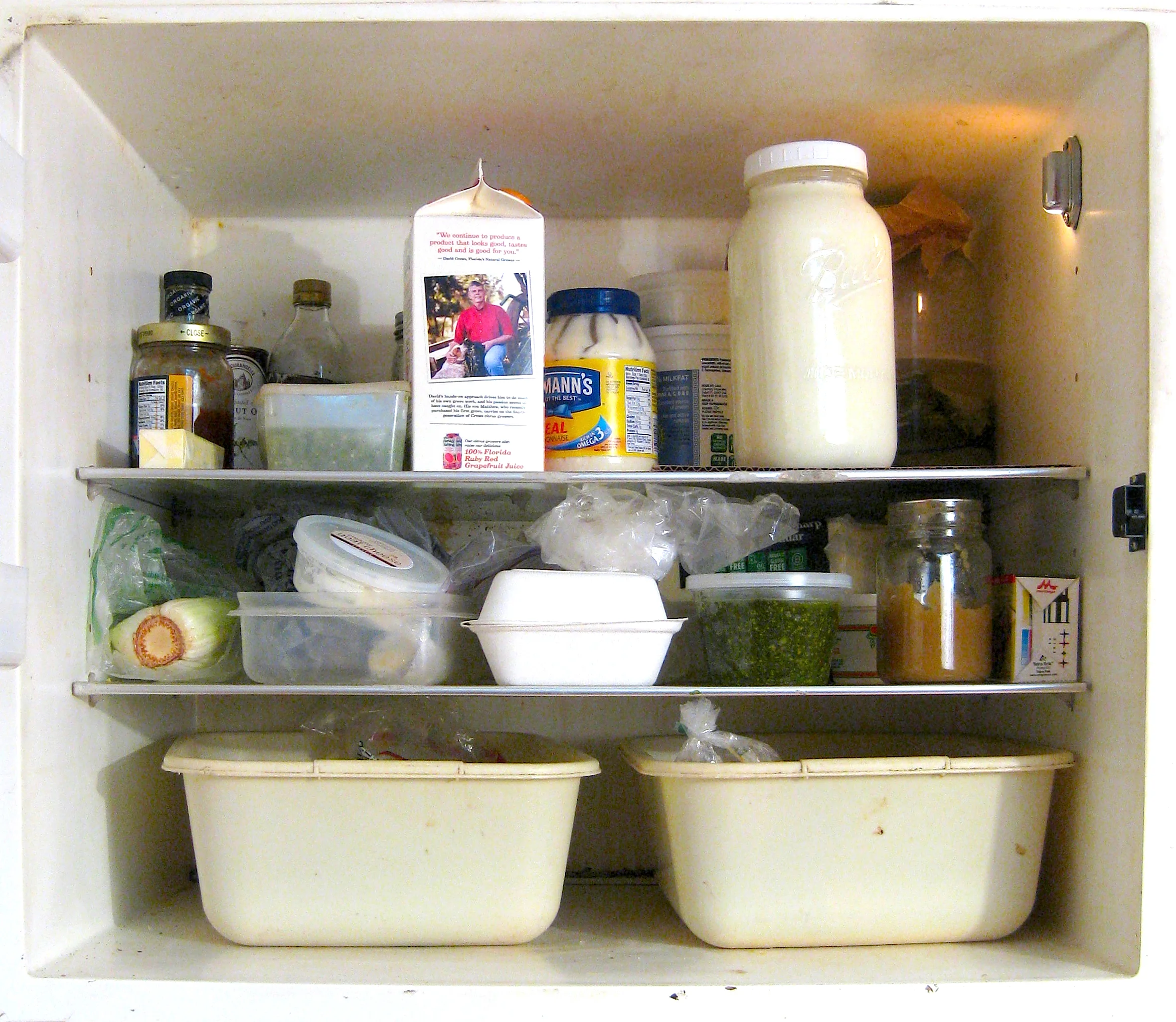 Gail: Milk and eggs. You don’t see eggs in our fridge but that’s because we use other parts of our house as our fridge, especially at this time of year. We put leftovers in the woodshed, which is frozen six months a year. The pantry is cold because we keep the door shut and we don’t have central heating: eggs are out there. Sweet potatoes, squash, and onions are upstairs in a room that stays pretty cold. And then we have a cold cellar where there are carrots, leeks, potatoes, beets, rutabagas, and turnips. We also have a deep freezer in the woodshed.